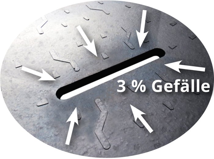 Surface incurvée avec une double pentes d’environ 3% vers les fentes :